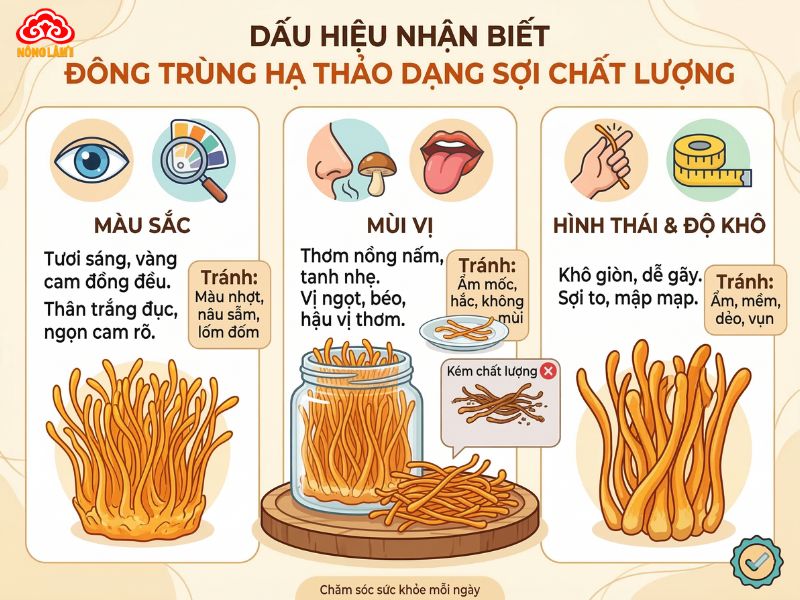 Để mua được đông trùng hạ thảo dạng sợi chất lượng, người dùng cần đánh giá kỹ các đặc điểm cảm quan như màu vàng cam tươi, mùi thơm nấm đặc trưng và sợi khô giòn, mập mạp. Đồng thời, việc kiểm về nguồn gốc, kiểm định, công nghệ sản xuất và chính sách tư vấn, bảo hành của đơn vị cung cấp là yếu tố then chốt để đảm bảo an toàn.