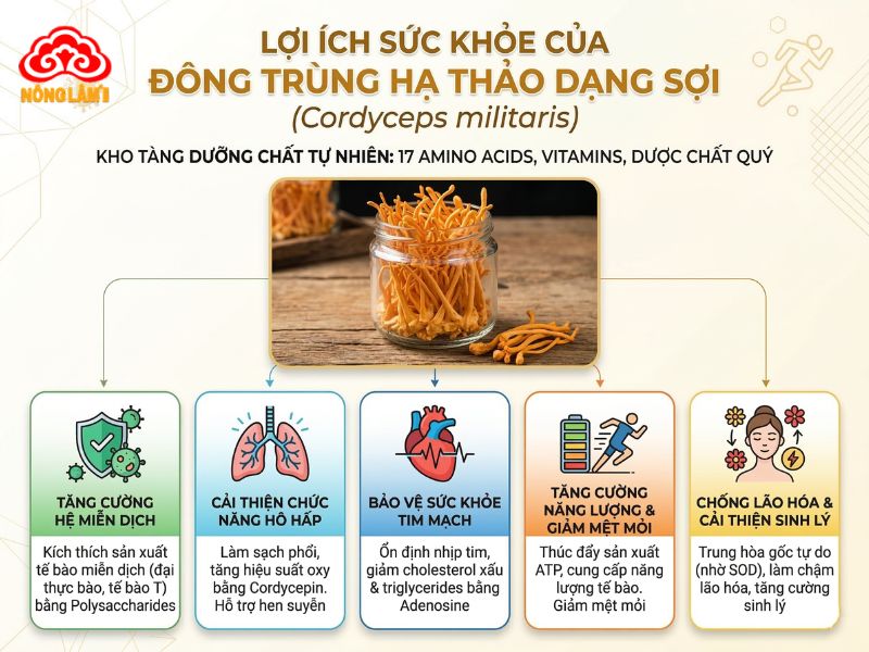 Đông trùng hạ thảo dạng sợi mang lại nhiều lợi ích cho sức khỏe nhờ chứa một phức hợp các hoạt chất sinh học quý giá, được cả y học cổ truyền và hiện đại đánh giá cao.