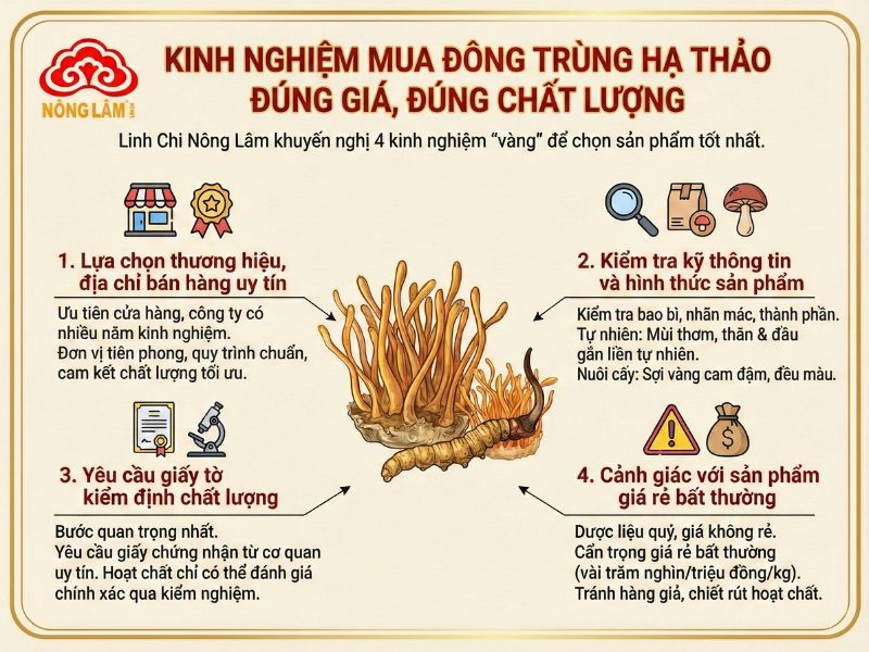 Để mua được sản phẩm đông trùng hạ thảo chất lượng với giá tốt, Linh Chi Nông Lâm khuyến nghị bạn nên lưu ý 4 kinh nghiệm “vàng” sau đây.