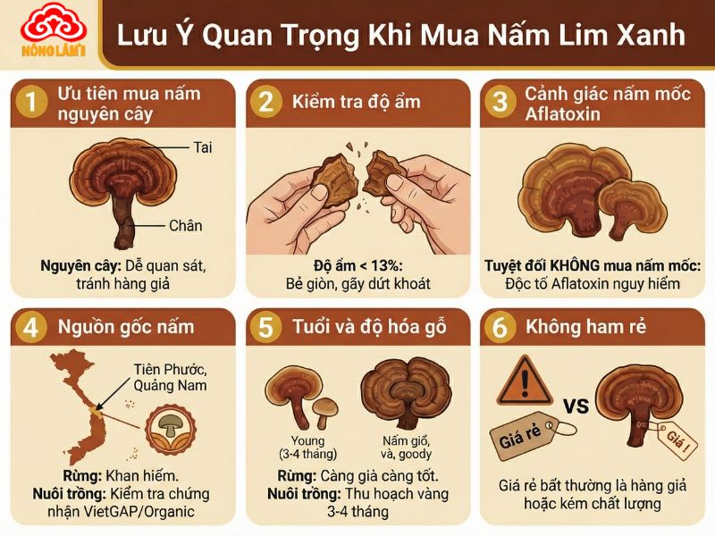 Để trở thành người tiêu dùng thông thái và bảo vệ sức khỏe, bạn cần đặc biệt chú ý đến một số yếu tố then chốt khi mua nấm lim xanh, bao gồm việc ưu tiên mua nấm nguyên cây, kiểm tra kỹ độ ẩm của sản phẩm, cảnh giác với nấm mốc Aflatoxin nguy hiểm, xác minh rõ nguồn gốc xuất xứ, đánh giá tuổi và độ hóa gỗ của nấm, và tuyệt đối không ham rẻ trước những lời chào mời thiếu cơ sở.