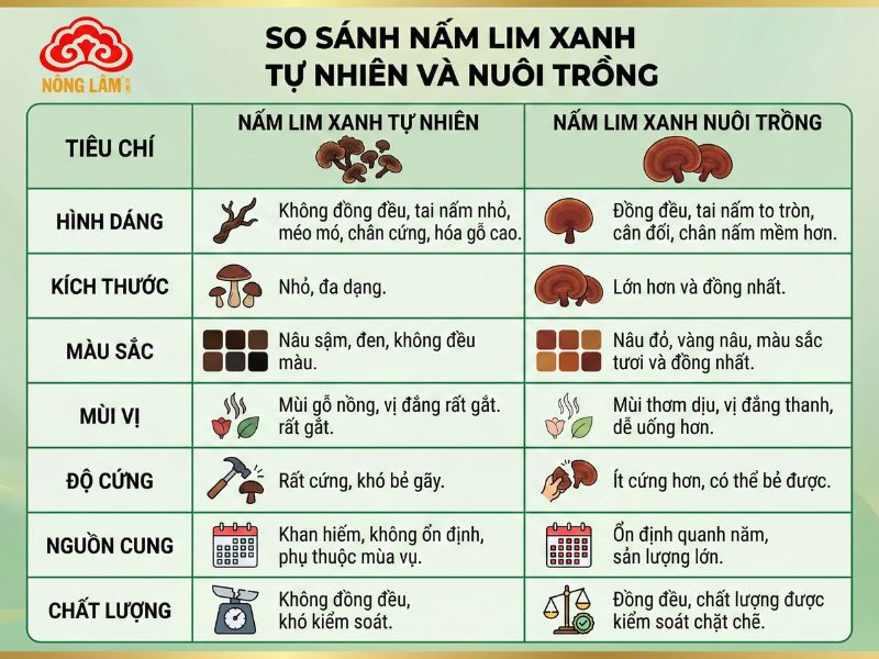 Bảng tóm tắt phân biệt Nấm Lim Xanh Rừng và Nuôi Trồng: