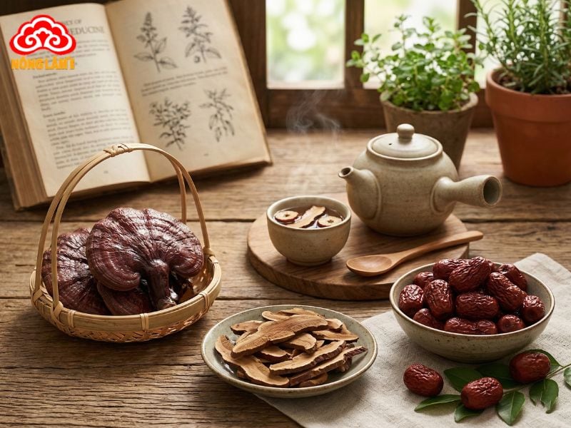 Nấm lim xanh (Ganoderma lucidum mọc trên gốc lim) là một loại dược liệu đặc hữu mang trong mình hệ thống hoạt chất sinh học vô cùng mạnh mẽ với hơn 100 loại Triterpenes khác nhau. Táo đỏ (Ziziphus jujuba) là một vị thuốc đại bổ ôn hòa, nổi tiếng chứa hàm lượng Vitamin C dồi dào cùng các chất chống oxy hóa tự nhiên giúp kiện tỳ, ích khí.