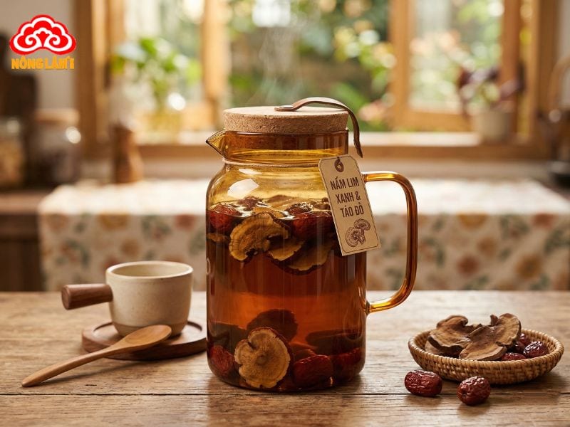 Sự kết hợp nấm lim xanh và táo đỏ tạo ra một thức uống bổ dưỡng giúp bồi bổ sinh lực, tăng cường hệ miễn dịch, hỗ trợ phòng ngừa ung thư, giải độc gan, ổn định huyết áp và mang lại giấc ngủ sâu.