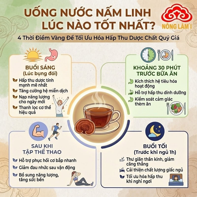 Có 4 thời điểm vàng để uống nước nấm linh chi nhằm tối ưu hóa khả năng hấp thu các dược chất quý giá của cơ thể: buổi sáng lúc bụng đói, khoảng 30 phút trước bữa ăn, sau khi tập thể thao và buổi tối trước khi ngủ 1h.